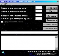 Предназначена для генерации случайных чисел, которые могут служить прогнозом для лотерей любого типа. Возможно задание диапазона, количества комбинаций и количество чисел в комбинации. Содержит функцию создания системы игры. Автор - В.Семеренко (wolf@fm.com.ua)