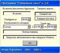 Программа умеет произносить текущее время при двойном щелчке по иконке в трее. Есть возможность установки будильника и "тихий час". При желании можно вывести окно с текущей датой и времени, которое будет находится поверх остальных окон.