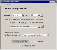 Отчёт "Анализ покупателей" для 1С: Торговля и Склад 9.2 выводит список покупателей и их показатели, рассчитанные за выбранный период. Для каждого покупателя выводятся четыре показателя: оборот, прибыль, прибыльность, процентная часть приносимой прибыли. Рассчитываются средние показатели.