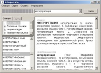 Interpretatio 1.4 - программа для поиска толкований слов по одному или всем установленным словарям.В дистрибутив входят следующие словари:1. Толковый словарь русского языка С.И.Ожегова и Н.Ю.Шведовой2. Словарь иностранных слов3. Толковый словарь русского языка под ред. Д.Н.Ушакова4. Новый толково-словообразовательный словарь русского языка. Автор Т. Ф. Ефремова5. Толковый словарь живого великорусского языка Владимира Даля6. Большой юридический словарь7. Большой психологический словарь8. Современный энциклопедический словарь9. Словарь русских синонимов и сходных по смыслу выражений" Н. Абрамова10. Орфографический словарь Лопатина На сайте разработчика доступны около 30 словарей, но пользоваться дополнительными - которые не входят в дистрибутив - можно будет только после регистрации программы.