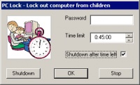 Программа позволяет ввести временные ограничения работы на компьютере. После заданного промежутка времени компьютер блокируется. Дальнейшая работа возможна только после введения пароля!