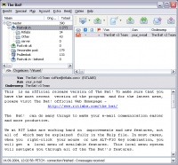 The Bat! Home 3.99.3 - Описание разработчика: "The Bat! – защищенная от вирусов программа электронной почты для Windows 95/98/W2K/XP, с русским интерфейсом и множеством уникальных функций, облегчающих повседневную работу. Почтовый клиент «The Bat!» разрабатывается компанией RitLabs начиная с 1996 года. С тех пор программа завоевала огромную популярность у пользователей, благодаря дружественному интерфейсу и множеству совершенно уникальных функций, делающих работу с почтой легкой и удобной. Основное отличие этой программы – чрезвычайно мощные возможности, гибкость в настройках, постоянное развитие программы, частый выпуск новых версий, дружественный интерфейс пользователя, поддержка семнадцати языков (с переключением «на лету»), оригинальная система шаблонов. Немаловажным достоинством является и встроенный диспетчер писем для манипуляции с почтой, позволяющий «отсекать» спам и рекламу непосредственно на сервере."