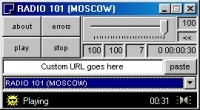 Оболочка под Windows Media Player. Для тех, кто любит послушать радио и тех, кому надоело щелкать Play каждый раз, когда теряется связь. Выбирай станцию и слушай. В новой версии список вырос до 29 русскоязычных радиостанций; "Русское Радио" сменило адрес WM; исправлена ошибка "Out of memory". Если вы знаете адрес нового потока той или иной радиостанции, копируйте его в поле Custom URL и слушайте!
