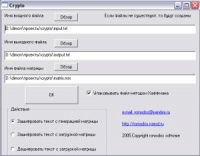 Универсальный шифратор. Использует алгоритм матрицы. Обрабатываются любые файлы любого размера с очень высокой скоростью. Расшифровать файл можно, только имея матрицу. Возможна генерация отдельной матрицы для каждого файла или для нескольких файлов. В новой версии добавлена упаковка файлов методом LZH.