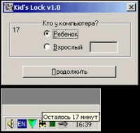 Простая программа, ограничивающая время, которое проводит за компьютером ваш ребенок. Автор - Дмитрий Елюсеев (vitas@inbox.ru).