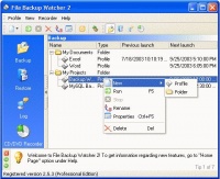 File Backup Watcher Pro 2.8.18 - Программа для резервирования файлов и каталогов как с последующей их архивацией, так и без нее. Резервирование может проходить как на локальной машине, так и по сети, через FTP или E-mail. Встроенный мастер создания профилей, позволяет не только выполнять "ручное" резервное копирование, но и настроить планировщик таким образом, чтобы резервное копирование указанных файлов автоматически выполнялось ежедневно, еженедельно, ежемесячно или разово в установленный день и время суток. Без регистрации работает 15 дней. Интерфейс - многоязычный. Файл русского интерфейса: скачать.