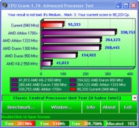 Утилита доля тестирования производительности вашего процессора.Имеет свою небольшую базу данных для сравнения, может создавать HTML отчёты, показывать различную информацию о CPU, загрузке системы и т.д.CPU Grave - это точный и красивый тестер центрального процессора работающий под Windows 9x-XP.Очень полезен при разгоне CPU, т.к.быстро и точно определяет общую производительность последнего.При тестировании одинаково загруженной системы, этот тестер, практически всегда, показывает абсолютно точный результат (погрешность измерения редко превышает сотые доли от результата теста).Программа также имеет специальное окно, содержащее некоторую информацию о процессоре (производитель, количество, модель процессора(ов), поддержка инструкций MMX, SSE, SSE2, 3D Now!, 3D Now Ex и др).Приятный пользовательский интерфейс не вызовет у пользователя непонимания, а точный и достоверный результат теста, сопровождаемый комментарием, дополнит общее впечатление о программе!