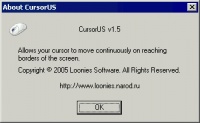 Данная программа позволяет Вашему курсору двигаться дальше при достижении границ экрана.Эффект достигается путем перевода указателя на противоположную сторону. В программе предусмотрено множество функций для ограниченного блокирования рабочего эффекта а также возможность установки горячих клавиш для управления программой.Все это настраивается через диалог "Настройки", который вызывается через контекстное меню значка на панели задач рядом с часами.CursorUS может использоваться для повышения эффективности работы не только с манипулятором типа "мышь", но и с трэкболом.Утилита имеет многоязычный интерфейс (Вы можете перевести ее на свой язык; для получения более подробной информации см.файл LngsEnglish.txt) и абсолютно бесплатна.