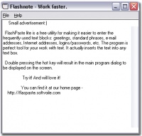 Как часто при работе за компьютером вам приходится что-то куда-то записывать на короткое время? Может быть вы говорите по телефону и вам надо записать номер, но до телефоной книжки далеко, может быть вам надо сохранить урл, что бы воспользоваться им через несколько минут, или просто скопировать 2 куска текста и откредактировать их, может быть еще что-то подобное.Примеров можно привести множество.Что вы делаете в таких случаях? Кто-то открывает Notepad, Кто-то пользуется персональными информационными менеджерами, кто-то другими программами предназначенными для хранения или обработки текстов.Но у всех этих вариантов есть один недостаток - скорость.Допустим вы используете PIM - как правило это программы тяжелого класса, к тому же прежде, чем воспользоваться им как черновиком - вам надо сначала найти место где можно безболезненно писать, не боясь "на мусорить" или повредить важные записи.Flahnote создана как раз для таких случаев.Когда вам нужен просто черновик для сохранения или обработки кусков текста.Flahnote - маленькая, быстрая и удобная.Достаточно просто нажать горячую клавишу и через долю секунды перед вами будет ваш черновик.закончили - нажимаете ESC, и программа прячется.Все просто.Теперь вам не надо ломать голову, где бы написать кусок текста, запускать notepad или открывать ваш любимый PIM.Все намного быстрее, проще и удобнее.Flashnote - не персональный информационный менеджер.Flashnote - Не электронная записная книжка.Flashnote - не заменитель блокнота или другого текстового редактора.Flashnote - просто рабочий "черновик", предназначенный для быстрой работы, он всегда под рукой и его никогда не жалко.Попробуйте и мы надеемся что вы приобретете верного помошника для вашей работы за компьютером.