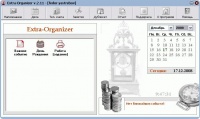 Extra-Organizer 2.13 - Описание разработчика:"Многофункциональный центр оповещения и контроля за важными событиями. Включает в себя мощную систему оповещений, календарь, напоминания, дела, заметки и будильник. Удобный, современный и одновременно простой интерфейс программы обеспечивает наиболее быстрое управление. Автоматический запуск и максимальная независимость от дополнительных действий пользователя гарантирует своевременное напоминание о важном событии."