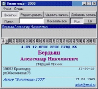 Удобный аналог обычной визитницы. Позволяет организовать визитки по алфавиту, осуществлять поиск, выводить визитки на печать. Автор - А.Бердыш (aclab@chat.ru).