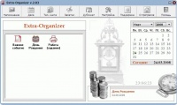 Extra-Organizer 2.03 - Описание разработчика:"Многофункциональный центр оповещения и контроля за важными событиями. Включает в себя мощную систему оповещений, календарь, напоминания, дела, заметки и будильник. Удобный, современный и одновременно простой интерфейс программы обеспечивает наиболее быстрое управление. Автоматический запуск и максимальная независимость от дополнительных действий пользователя гарантирует своевременное напоминание о важном событии."