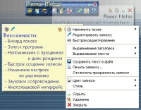 Power Notes 3.34 - Описание разработчика:"Многофункциональный планировщик / напоминалка / записная книжка для Windows, позволяющая создавать электронные записки (стикеры) и показывать их в нужный момент времени. Программа очень проста в использовании. Позволяет произвести детальную настройку размера, цвета и прозрачности заметки, горячих клавиш, времени и даты напоминания. Имеется возможность как быстрого, так и расширенного редактирования записок."