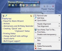 Power Notes - Описание разработчика:"Многофункциональный планировщик / напоминалка / записная книжка для Windows, позволяющая создавать электронные записки (стикеры) и показывать их в нужный момент времени. Программа очень проста в использовании. Позволяет произвести детальную настройку размера, цвета и прозрачности заметки, горячих клавиш, времени и даты напоминания. Имеется возможность как быстрого, так и расширенного редактирования записок."