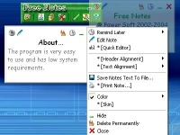 Это бесплатный планировщик, напоминалка, записная книжка для Windows, позволяющая создавать электронные записки и показывать их в нужный момент времени.Удобный редактор записок позволит легко найти нужную вам заметку.Программа дает возможность настроить основные параметры заметок, такие как цвет, размер и прозрачность записки, звук при показе, а также время и дату напоминания.Программа проста в использовании.Пользуйтесь Free Notes и вы никогда ничего не забудете!