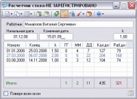 Расчетчик стажа - Программа "Расчетчик стажа" адресована работникам отделов кадров, бухгалтерам и вообще всем, кто работает с датами и временными периодами. Она позволяет вычислять количество лет, месяцев и дней между датами, расчитывать общий трудовой стаж сотрудника по записям в трудовой книжке, определять конечную дату периода, складывать и вычитать стаж, распечатывать введенные данные, сохранять эти данные в файл и загружать их из файла. Для использования требуется NET.Framework версии 2.0 или выше