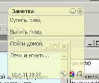 Небольшая программа для создания заметок на экране монитора. Основные возможности: полупрозрачный фон (Win2000), автозапуск, часы в заголовке заметки, создание заметок с текстом из буфера одним кликом мыши, редактируемый цвет фона. Автор - Сергей Алексеев (goradm@rvcgns.chtts.ru).
