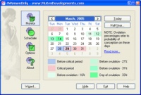 Этот календарь отображает женские критические дни розовым цветом, дни овуляции - зеленым цветом, последний день перед критическим периодом - синим цветом. Показывает процент вероятности зачатия.