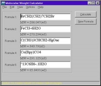 Для тех, кто в своей работе встречается с громоздкими химическими формулами. Позволяет рассчитывать молекулярный вес соединения, переводить моли в единицы массы и обратно. Имеется возможность запоминать часто используемые формулы, редактировать данные, заложенные в программе.