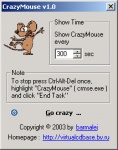 Хотите подшутить над своими друзьями !?! Попробуйте CrazyMouse - программу, которая через заданный промежуток времени превращает стандартный курсор в сумашедшую "дерганную" мышь. К тому-же это сопровождается звуковым эффектом. А примерно через две секунды все восстанавливается ( разумеется на определенное время :) ).