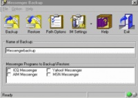 Утилита для резервного копирования и аварийного восстановления архивов сообщений большинства популярных программ-мессенджеров - ICQ, AIM, Yahoo!IM и MSIM. Сохраняются также линки, списки адресатов и т. д. Messenger Backup очень удобно использовать для синхронизации ваших мессенджеров, установленных на разных компьютерах.