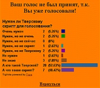 Скрипт для опроса (голосования) посетителей сайта. Выводит результаты голосования в виде графика с указанием количества проголосовавших за каждый вопрос и процентного отношения голосовавших по каждому вопросу. Автор - А.Панкратов ( tigra@lgg.ru).