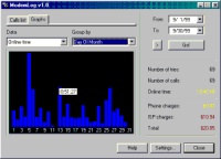 Ведет статистику времени и стоимости соединения с провайдером. Позволяет учитывать различные тарифные планы. Возможен вывод статистики в виде диаграммы. Подсчет ведется на основе лог файла модема Windows или любой программы дозвона. Автор - В.Огиренко (modemlog@dcslab.moldline.net).