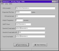 Простая утилита, проверяющая через заданный интервал времени размер файла на веб-сервере по указанному адресу и/или фрагмент текста, содержащегося на этой странице. Если программа обнаружит изменения, то она автоматически оповестит вас по электронной почте. Поддерживает http и https.