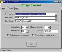 Программа предназначена для проверки proxy серверов. Программа позволяет брать списки прокси как из текстовых, так и из HTML файлов; использовать разные форматы списков proxy; проверять списки proxy любого размера и многое другое.
