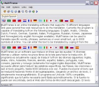 MultiTranse 5.4 - Переводит текст с/на 13 языков, включая английский и русский. MultiTranse может переводить как отдельные слова, так и небольшие фразы, предложения или тексты размером не более 6000 символов. Поддерживается 100-процентная Юникод совместимость, при этом MultiTranse может перекодировать юникод-текст в ANSI формат любой кодировки и обратно. Еще одной особенностью программы является автоматическая установка шрифта - если MultiTranse не находит в системе нужного шрифта, то она предлагает загрузить соответствующий его из интернета. Для работы программе требует интернет-соединение, так как при перевода она использует он-лайн ресурсы. Интерфейс - многояычный.